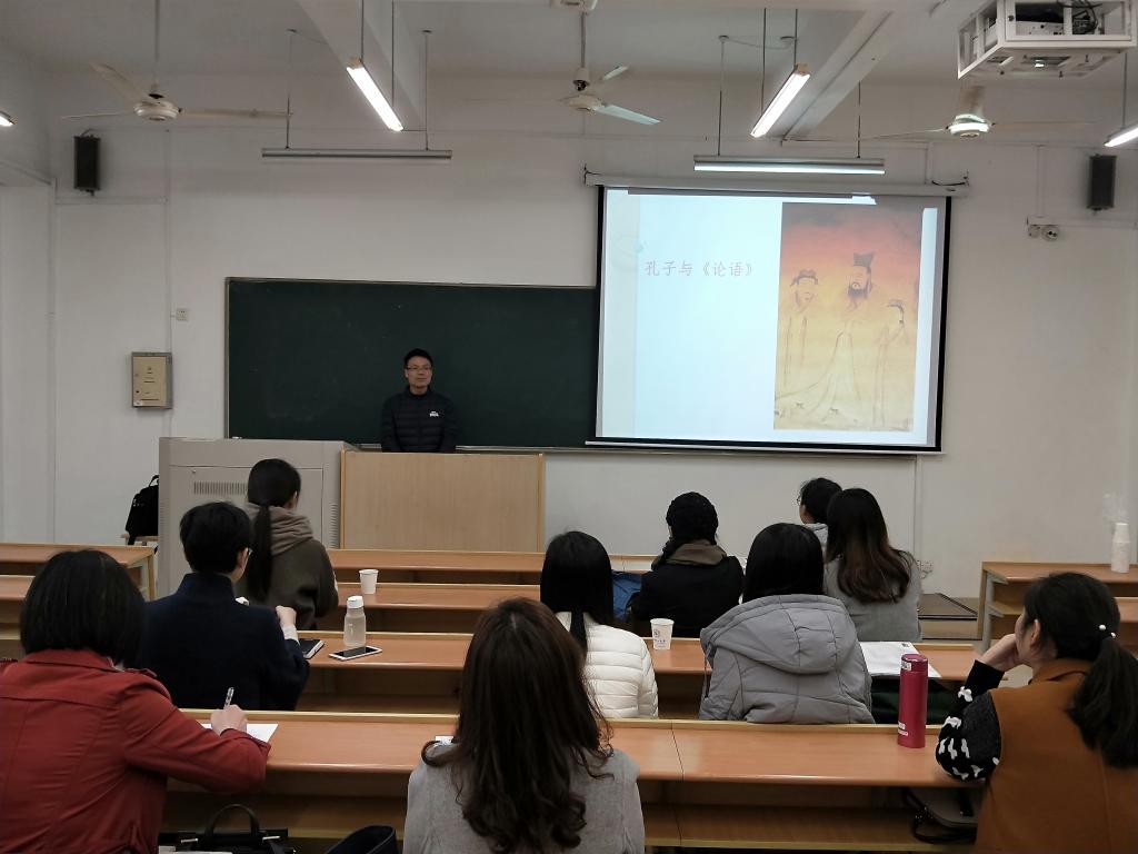 薛亚军老师选取了中国古代文学中的论语章节,为我们进行了45分钟的示范授课。首先,他以介绍孔子的生平为切入点,结合现在最新的科考发现,运用幽默的语言,采用问答的方式,为大家展现了一个真实的孔子。随后,薛老师又从孔子的思想、孔子的贡献、论语的经典话语等方面展开,引古论今,侃侃而谈,话题层层相扣,引人入胜,较强的互动性让师生们收获颇多,给师生们上了一堂生动而富有意义的示范公开课。