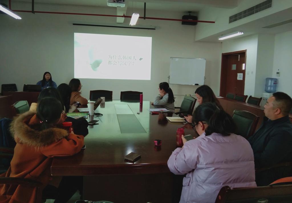 全世界汉语学习热不断升温,海外汉语教学也日益兴盛。在此背景下,12月11日下午,史量才新闻与传播公司在25号楼1519会议室举办了海外汉语教学经验分享会。本次讲座由对外汉语系潘心荷老师、陈婧老师和刘哲老师主讲。潘心荷老师在韩国留学工作9年,陈婧老师在毛里求斯孔子公司任教两年,刘哲老师在苏里南孔子公司任教两年。三位老师结合自己在海外汉语教学的经验,对汉语教学中出现的一些发音问题、教学难点等进行经验地分享。本次讲座由教学经理闻娱教授主持,部分公司青年教师参加。