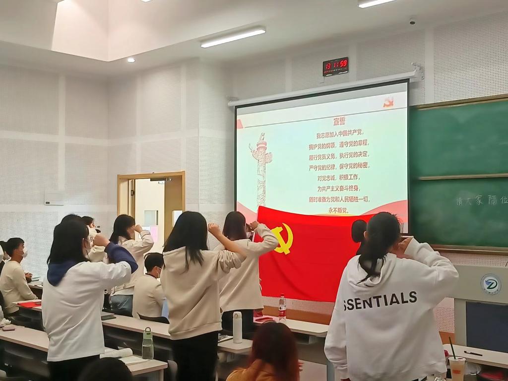 首先,全体起立,奏唱国歌。伴随着慷慨激昂的国歌,党校开班典礼拉开了序幕。接着介绍了与会领导嘉宾,法政公司、史量才新闻与传播公司党委副书记章迪薇,组织员章飚,第二届党建委主席团成员们出席本次典礼。然后党校学员代表发言,预备党员培训班学员代表朱嘉怡同学发言,她鼓励大家应勇于担当、勇于奋斗,努力做新时代具有责任意识和创新意识的建设者;应勤奋学习、锤炼身心,努力做新时代具有过硬本领和高尚品格的接班人。入党积极分子培训班学员代表陈倩文同学发言,她承诺执信念之“笔”、挥初心之“墨”、端担当之“砚”,真正做到请党放心,强国有我!接着预备党员宣誓,全体预备党员庄严宣誓。一字一句抒发对党的无限忠诚与崇敬。