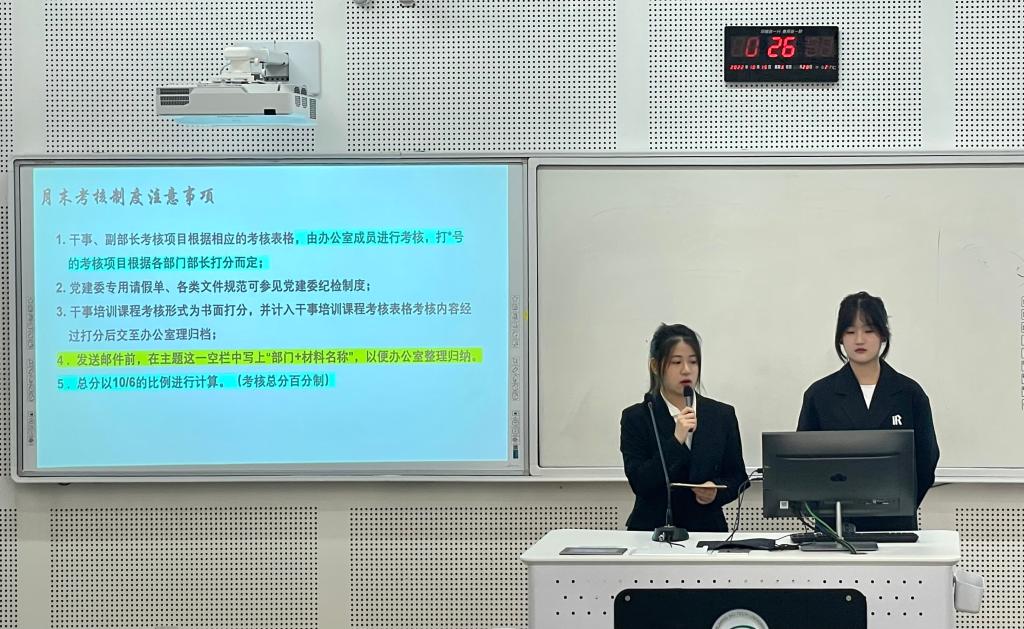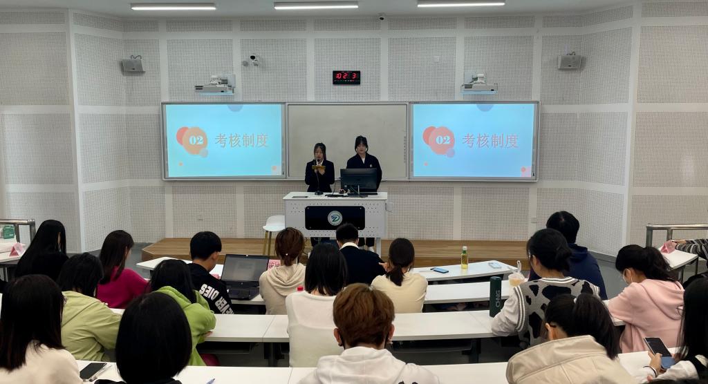 首先,办公室干事张茜、林洛瑶对纪检、考核、财务三大制度及工作理念进行了详细介绍,拉开了本次制度宣讲会的帷幕。纪检制度涵盖了部门及个人考核、工作计划书、材料归档等多方面内容,明确了考核标准,推动考核工作标准化、结果公开化;对于考核制度,则主要介绍了月末考核、材料归档考核、常规纪检工作考核、会议扣分、常规财务工作考核五个方面的考核办法及注意事项;财务制度主要涉及了财务预算审批及清算流程、挂账及采购制度、赞助相关事宜三方面内容;“服务与管理”“规划与创新”则是对工作理念的概括凝练。