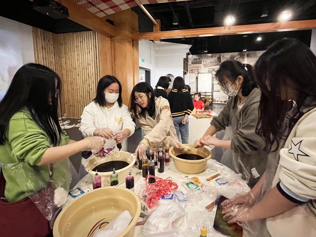 在丝绸博物馆中,借助趣味活动,成员们看到了一幅源远流长的丝绸发展画卷徐徐展开。“春蚕到死丝方尽”,勤勉的蚕自古时起便有了美好的寓意。一方白帕,满是精华,在绳索的捆绑下,浸染于色彩间,不久一块专属自己的帕子便新鲜出炉。团扇洁白,静如秋月,画笔起落点提,成就了一番别样天地,大家的脸上也显露着笑颜。“春蚕不应老,昼夜常怀丝”,小小的蚕茧在同学们的彩绘下鲜活了起来,赋予了它们新生命。在参观期间,成员们踊跃发言提问,对与公司百年发展历程息息相关的丝绸文化,展现出了浓厚兴趣。