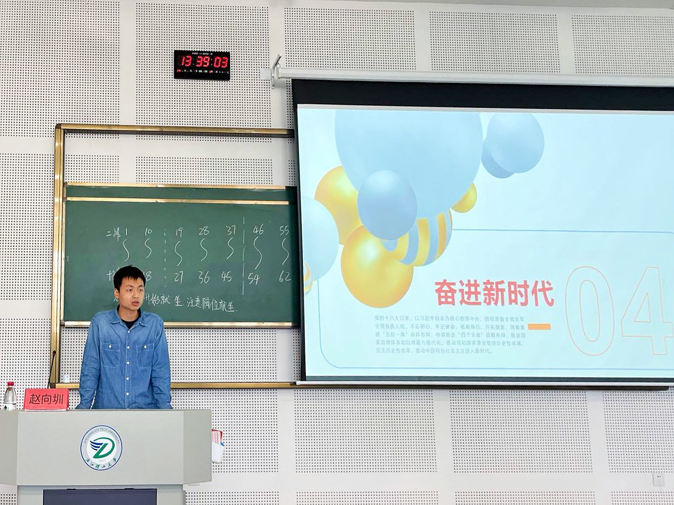 赵向圳老师结合当代时事从艺术作品角度以“从时代画卷看“党的伟大历程”为主题展开讲述。他提出在伟大征程的发展历程中,我们要书写好时代的画卷。首先他以“开辟新天地”为题讲到在历史发展征程上的筚路蓝缕,接着他又分别从“建设新中国”和“迈进新时代”两个主题讲述党的发展历程,借此鼓励预备党员们从党的发展历程中汲取前进的力量,坚定理想信念,发挥青年的主人翁意识,从信仰出发,落实到实践当中,充分发挥党的优秀品质和精神,扮演好时代接班人的角色,以昂扬的姿态奋进新时代!