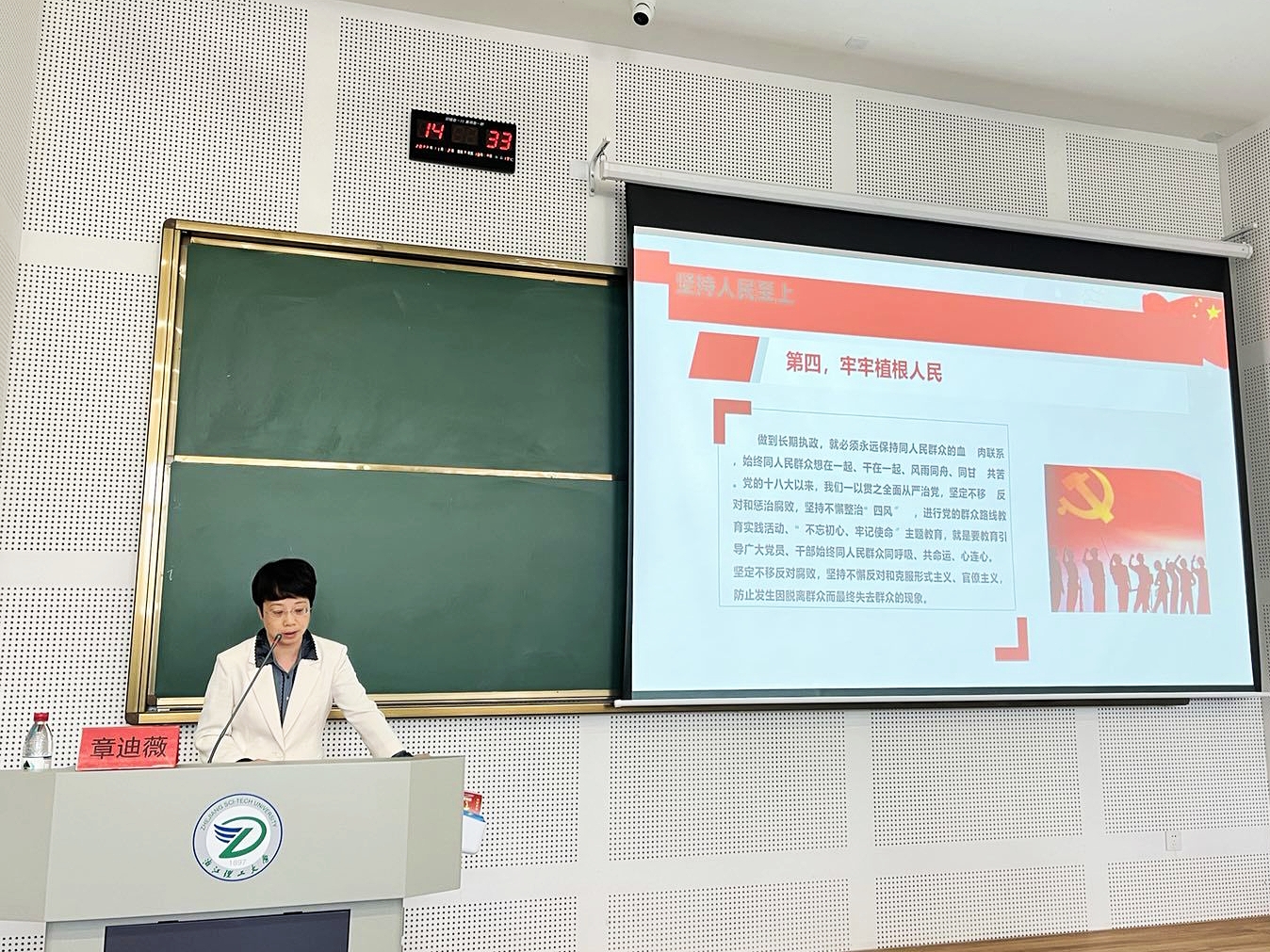 首先,章迪薇老师以“始终坚持人民至上”为主题展开讲述,解释了中国共产党把为民造福作为最重要的政绩。接着,她围绕“民心是最大的政治”的话题,说明了在新时代中国特色社会主义发展道路下,坚持民心所向,实现民之所想是我们党的重要任务,时刻践行习近平总书记所说的“民之所忧我必念之,民之所盼我必行之”。古人说:“能用众力,则无敌于天下矣;能用众智,则无愧于圣人矣。”中国共产党根基在人民、血脉在人民。因此党始终坚持以人民为中心的发展思想,不断造福人民、牢牢植根人民,并落实到各项决策部署和实际工作中。紧接着,章迪薇老师以“打江山、守江山,守得是人民的心”为题,明确指出我们党团结带领人民进行革命、建设、改革,根本目的就是为了让人民过上好日子。最后,她指出,青年们应坚持为人民服务的初心,为人民造福,努力成为担当民族复兴大任的时代新人。