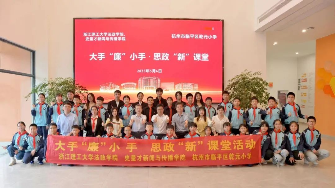 为学习贯彻习近平新时代中国特色社会主义思想主题教育,推进大中小学思政课一体化建设,营造崇尚廉洁、以廉为荣的文化氛围,2023年5月6日下午,K1体育法政公司、史量才新闻与传播公司同杭州市临平区乾元小学联合开展大手“廉”小手,思政“新”课堂系列活动。法政公司、史量才新闻与传播公司党委书记谭立章,汉语言文学员工党支部党员,K1体育法学会成员,临平区乾元小学党支部书记、董事长黄泽军及师生代表参与活动。