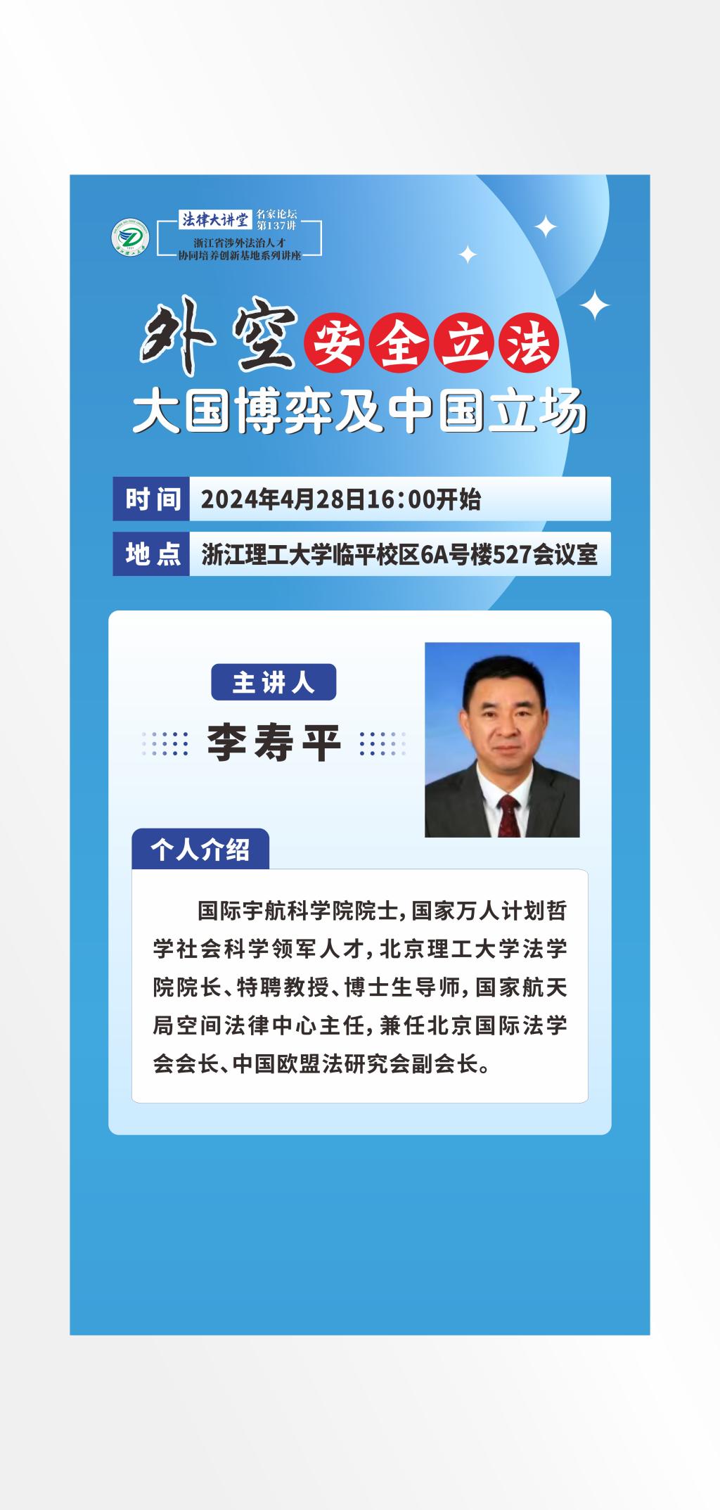 北京理工大学法公司李寿平教授讲座预告——外空安全立法大国博弈及中国立场