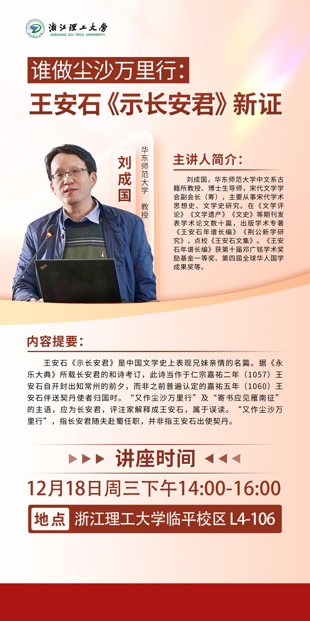 刘成国教授讲座预告——谁做尘沙万里行:王安石《示长安君》新证
