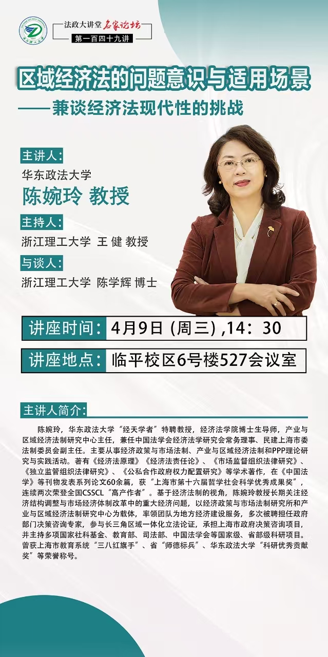 陈婉玲教授讲座预告 区域经济法命题的问题意识与适用场景一一兼谈经济法现代性的挑战