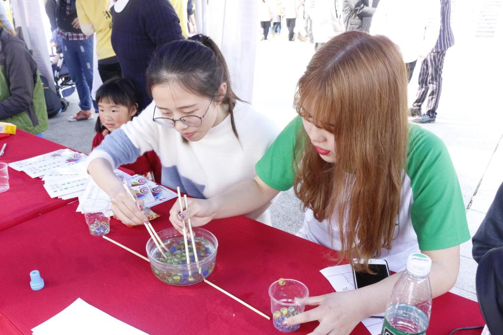 社工系员工在“未来展示区”集中宣传,积极向来我系展位参观、咨询的当地居民和游客介绍浙理社工信息,并免费发放社工系和社会工作协会的宣传册。此外,为活跃现场气氛,吸引人流,社工系员工设计了“水中夹弹珠”游戏,获得大家的广泛参与。