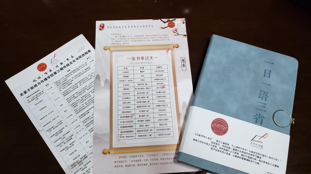 初秋时节是许多新生开启老员工活的高峰期,也是他们掀开大学之书的“卷首页”。近日,公司2020级新生们,初入校园就意外地领到了一本精美也很特殊的笔记本。这并不是普通的笔记本,而是由公司思政课名师“方平工作室”和公司传统文化书院一起制作的“传统文化教程”,一本笔记本、一张书单和一张进修单,让这些校园新萌们倍感新鲜,也颇感责任。
