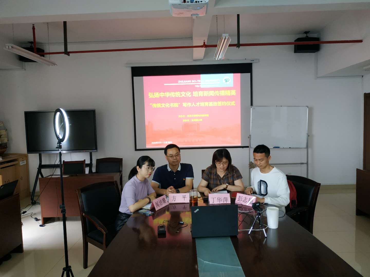 6月11日下午,“传统文化书院”写作人才培育基地云端签约仪式暨2020届本科生毕业捐赠仪式在25号楼1519会议室举行。史量才新闻与传播公司党委副书记、思政名师工作室负责人方平,学工办主任丁华萍,汉语言员工党支部书记闻洁璐,通过网络与远在四川省乐山市金口河区金河镇小学董事长白方君,以及师生代表们共同参与本次签约仪式。