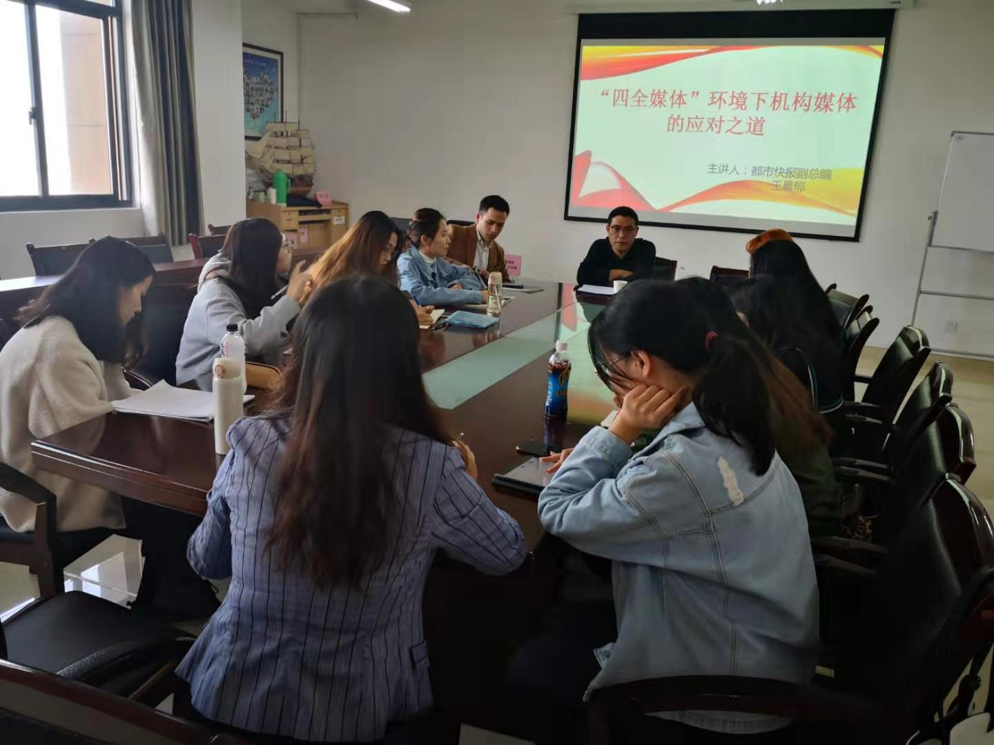 10月31日下午,王晨郁先生应邀来公司做 “‘四全媒体’环境下机构媒体的应对之道”的学术辅导讲座。副经理闻娱及公司传播系研究生和部分教师参加了讲座。