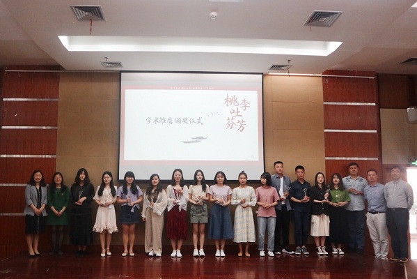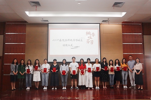 “桃李吐芬芳”活动中,典礼对26位院级优秀毕业生进行表彰,并为31位升学成功的毕业生颁发了“学术雏鹰”奖杯。随后,毕业生代表张紫萱和考取浙江大学研究生的张海航分别做了精彩发言,讲诉了求学路上的点滴,表达了对母校以及老师的真挚感情和深深眷恋,并表示作为新传学子,将不负时代、国家、公司所望。