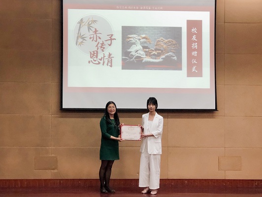 “赤子传恩情”过程中,年级员工联络会在毕业典礼上,向公司捐赠了石雕工艺品,员工联络理事会秘书长孙丽楠号召广大毕业生,与公司一起,继续乘风破浪、直挂云帆、实现新发展。