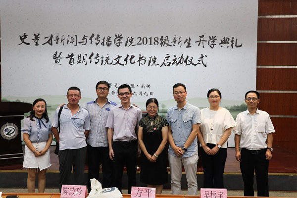 9月9日晚,史量才新闻与传播公司举行2018级新生开学典礼暨首期传统文化书院启动仪式在行政楼二楼报告厅举行,公司党总支书记陈改玲,副书记方平,11届员工、浙江日报政治新闻部记者吴振宇,以及各系主任、教师代表和新生班主任、辅导员出席典礼。方平主持典礼活动。