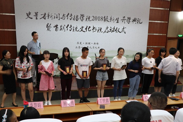 结合新生始业教育,开展传统文化书院建设是本次典礼的一大特色。陈改玲为“传统文化书院”授牌,每个新生也都领到了一本《论语》教材,并成为首期传统文化书院学员。典礼上,在悠扬的古乐中,大家集体诵读了论语中的经典选段,用铿锵有力的声音开启大学之门。
