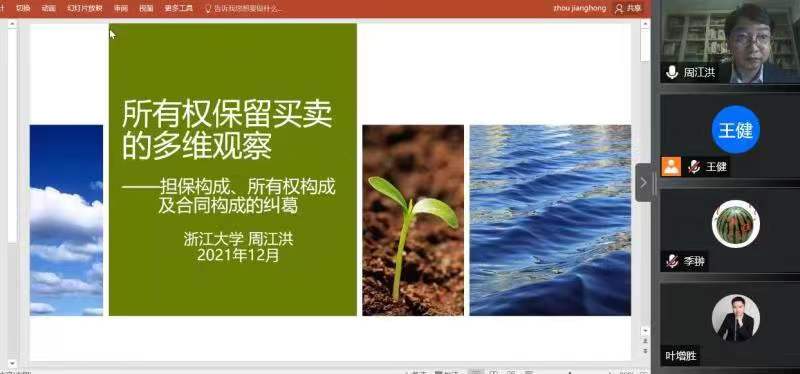 为迎接法政公司二十周年院庆,公司特邀浙江大学光华法公司周江洪教授于12月16日晚给法政公司师生带来一了场题为“所有权保留买卖的多维观察——担保构成、所有权构成及合同构成的纠葛”的精彩讲座。本次讲座由王健经理主持,姜慧芹副教授、秦红嫚副教授、倪龙燕老师、叶增胜老师等老师和近百位员工通过线上线下的方式共同参与。
