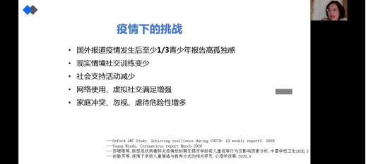 讲座中,缪群芳教授以目前青少年心理调查研究与数字媒体的使用现状作为背景介绍,凸显了青少年心理问题越发凸显,在心理问题检查率与抑郁的检出率两个数据说明了青少年心理问题不容忽视。缪群芳教授以实际医学工作经历与调查报告进行结合,指出青少年常见的焦虑、孤独感、家庭冲突等疫情下的新挑战,并分析了疫情时期青少年数字媒体的使用特点,网络霸凌、虚拟世界的迷茫成为青少年数字媒体使用的问题,并以此为基础探讨数字社会中青少年心理问题的处理之道。
