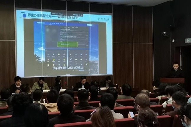 会议开始,信息中心综合科安坤科长先就公司临平校区线上建设情况——智慧教学系统向各位老师进行展示,还就“师生办事典型应用——数智浙理综合门户”“常遇问题集锦——通行码、访客码灰色”“近期项目建设情况——移动5G专网的建设情况”等一些老师常见的问题和正在建设的一些项目进行讲解。