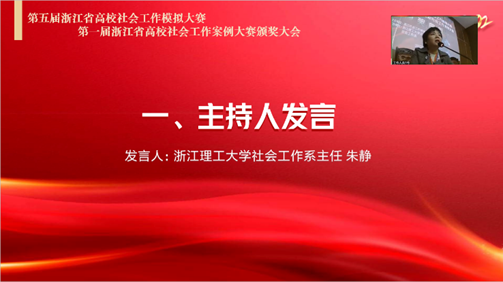 典礼伊始,由K1体育社会工作系主任朱静老师致开场词。朱静老师表示,两赛的举办有助于引导社工学子关注社会工作的实际问题,提升社工学子的专业实践能力,推动理论教学与实务的结合。同时,两赛也为浙江省各高校社工学子交流专业理论知识和实务经验提供了一个良好的平台,加深了社工学子对专业技巧和方法的理解和运用,展现了社工学子的风采。