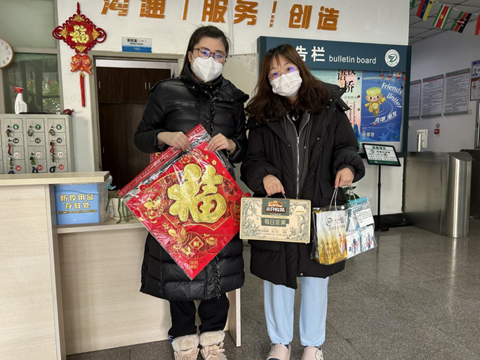 1月16日上午,法政公司、史量才新闻公司职工管理员许逸鑫代表公司来到友谊楼慰问寒假留校的职工,叮嘱员工们寒假期间要继续做好个人防护,鼓励员工们积极参加公司为职工组织的丰富多彩的迎新春活动,过一个安全、充实的寒假,并送上了防疫物资和新年大礼包。未留校的境内职工也将收到公司通过快递寄送的大礼包和新春祝福。