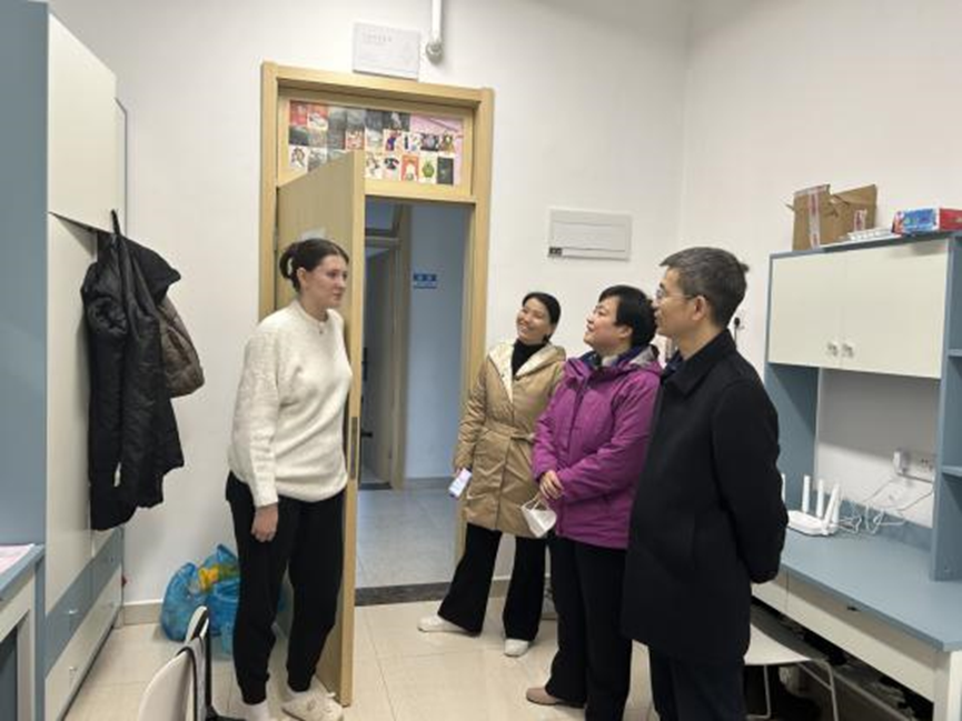 在14号楼职工宿舍,各位领导与公司乌克兰职工希娅亲切交谈,详细了解寒假期间的生活学习状况,并温暖嘱托希娅及时调整心态、开启新学期的学习,在生活和学习上遇到任何困难及时与公司老师们联系。