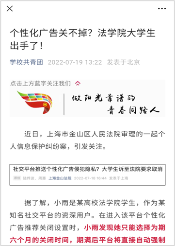 这起诉讼案件被《南方周末》《松江报》等媒体报道,仅微信公众号的阅读量便超过十万,产生了极大的社会影响。审理该案的金山法院、上海高院的官方媒体平台也相继推送报道,并向某社交平台提出司法建议。此外,该案也被《中国青年报》《公司共青团》报道,受到了广大青年同侪的支持与认可,共同助推了个人信息保护在全社会形成共识。