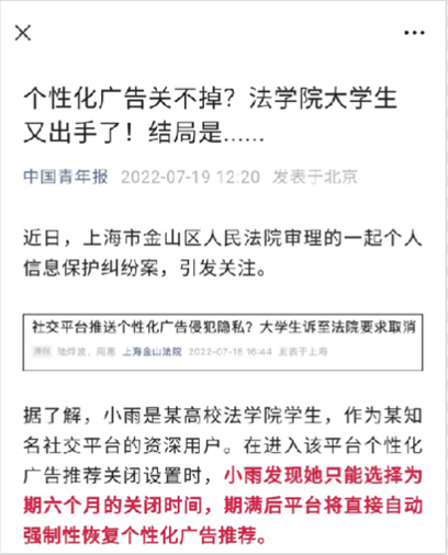 公司互联网法律援助中心五位同学的参赛项目聚焦于关闭某社交平台个性化广告推荐服务后其自动强制性的恢复行为侵害了用户的个人信息权益。个性化广告推荐技术通过搜集用户的个人信息,进行大数据分析,用于内容及服务的精准定制与广告的精准投放。此前用户如果想要关闭某社交平台的个性化广告推荐,需要经历约十道关卡,同时在经历了如此繁杂的关闭流程后,该平台个性化广告推荐服务仍会在六个月后自动开启。复杂的关闭流程与自动开启背后,是对用户个人信息权益的侵害。