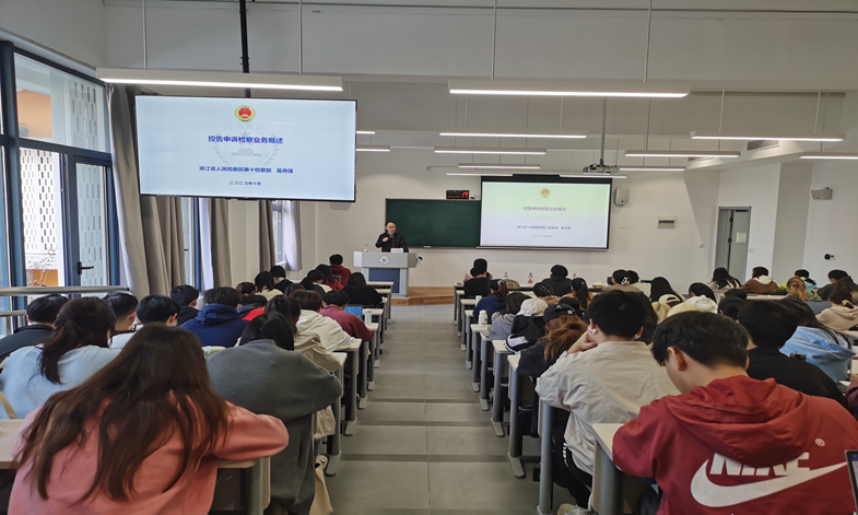 2023年10月20日下午,为进一步贯彻落实好“检校合作”工作部署,促进法学理论教学与司法实践有机结合,推动未来检察人才的培养,浙江省人民检察院第十检察部莫舟强主任应邀请亲临法政公司,为法学专业员工讲授了以《控告申诉检察业务概述》为主题的实践课程,同时也拉开了公司与浙江省人民检察院合作的《检察理论与实务》系列实践课程的序幕。法政公司经理助理、法律系党支部书记姜慧芹老师主持本次主题实践活动并发表欢迎致辞;法律系王娅老师和王丽老师出席,鼓励同学积极探索控告申诉检察业务的理论与实践问题,开展更为丰富的“法律诊所”实践课程活动。