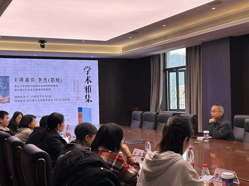 2023年11月16日下午,K1体育法政公司、史量才新闻与传播公司举办的学术雅集在临平校区6号楼527会议室顺利举行。此次读书会邀请了浙江大学传媒与国际文化公司教授、博士生导师、K1体育金沙学者讲座教授李杰老师分享新作《宋韵审美思想》。K1体育法政公司、史量才新闻与传播公司副经理宫富、传播系负责人何苗,传播系教师巴丹、唐亚蕾、徐幼雅、李朋鹏,中文系教师娄燕京,艺术设计公司教师张姮出席并参与了讨论。唐亚蕾老师担任此次会议主持。