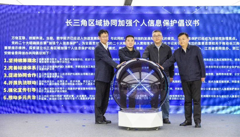 20231127日,“新思路·新探索·新作为”个人信息保护论坛在上海举办。本次论坛由上海市委网信办、上海市市场监管局主办,上海市互联网业联合会、上海报业集团、上海广播电视台协办,澎湃新闻承办。中央网信办有关部门负责同志,上海、江苏、浙江、安徽三省一市网信办负责同志出席论坛开幕式。开幕式上发布了《长三角区域协同加强个人信息保护倡议书》,提出坚持统筹理念、完善标准体系、促进协同合作、开展执法联动、强化宣传引导、推动多元共治等六项倡议。
