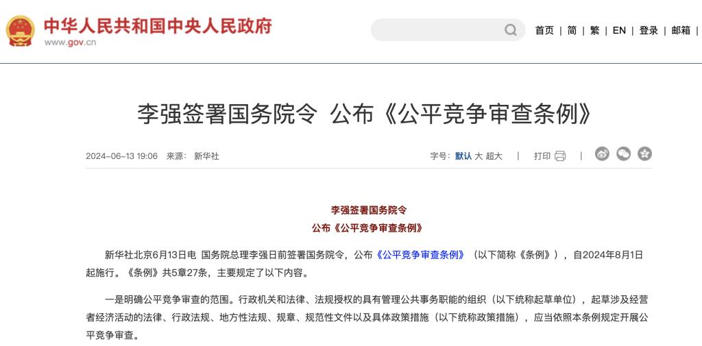 根据6月13日中国政府网消息,国务院总理李强日前签署国务院令,公布《公平竞争审查条例》,自2024年8月1日起施行。