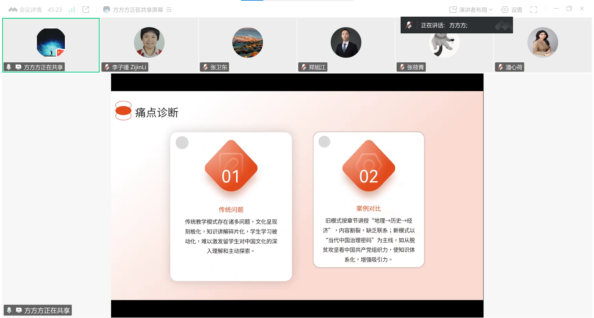 方洁老师围绕《学情导向的<中国概况>课程改革与实践》展开分享。针对近年来职工生源结构变化带来的新挑战,方老师详细介绍了课程团队实施的改革举措:建立"语言能力+学习需求"双维度分层教学体系,通过实时学情监测实现教学内容弹性优化。这些创新做法为国际化课程建设提供了宝贵经验。