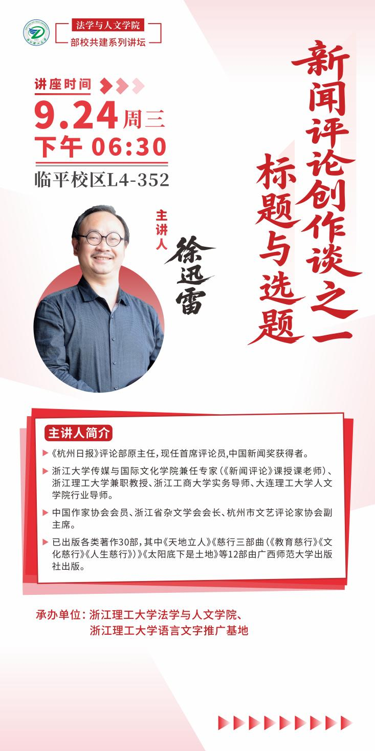 2025年9月24日18:30,K1体育部校共建讲坛在临平校区L4-352开讲。本次讲座特邀《杭州日报》首席评论员徐迅雷,结合实战经验,解析新闻评论创作的艺术与技巧。活动由K1体育、K1体育语言文字推广基地承办,公司教师孙卓君主持,传播系本科生到场聆听学习。