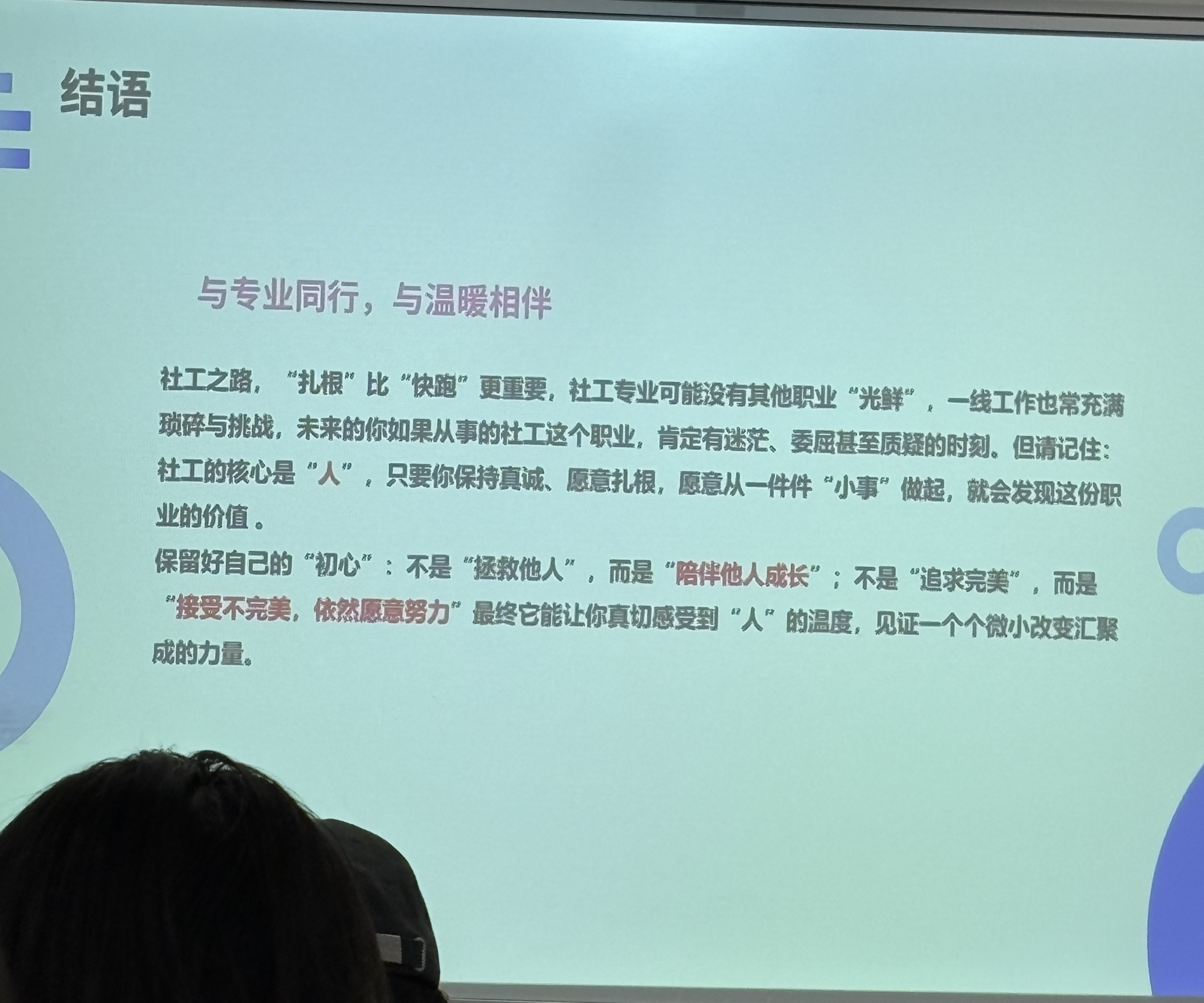 此次讲座的成功举办,搭建了学界与业界的沟通桥梁,让研一新生对社工行业有了更全面、深刻的认知。未来,相信学子们将以此次分享为契机,明确发展方向,锤炼专业本领,在社工领域绽放青春光彩,用专业力量传递温暖与希望。