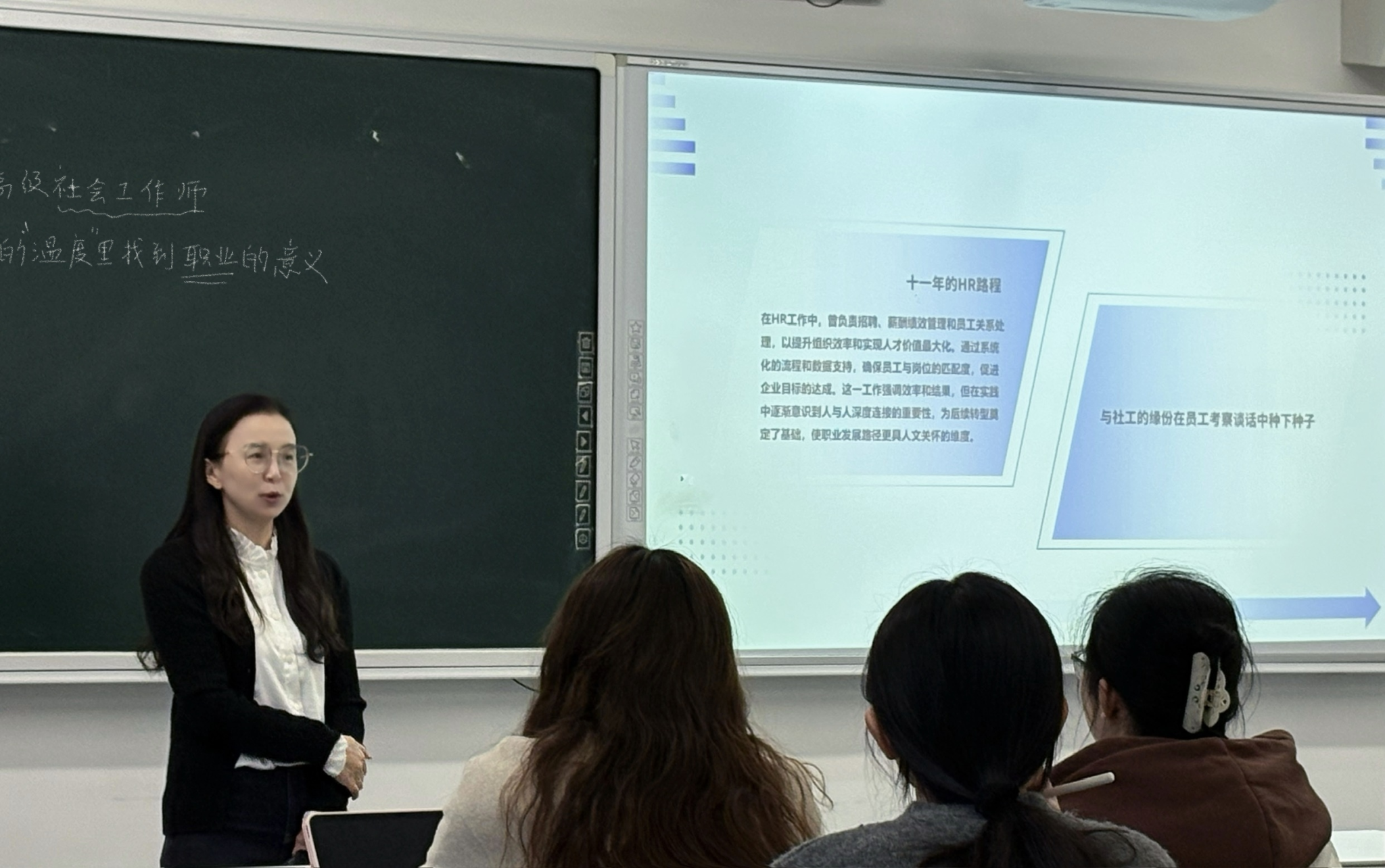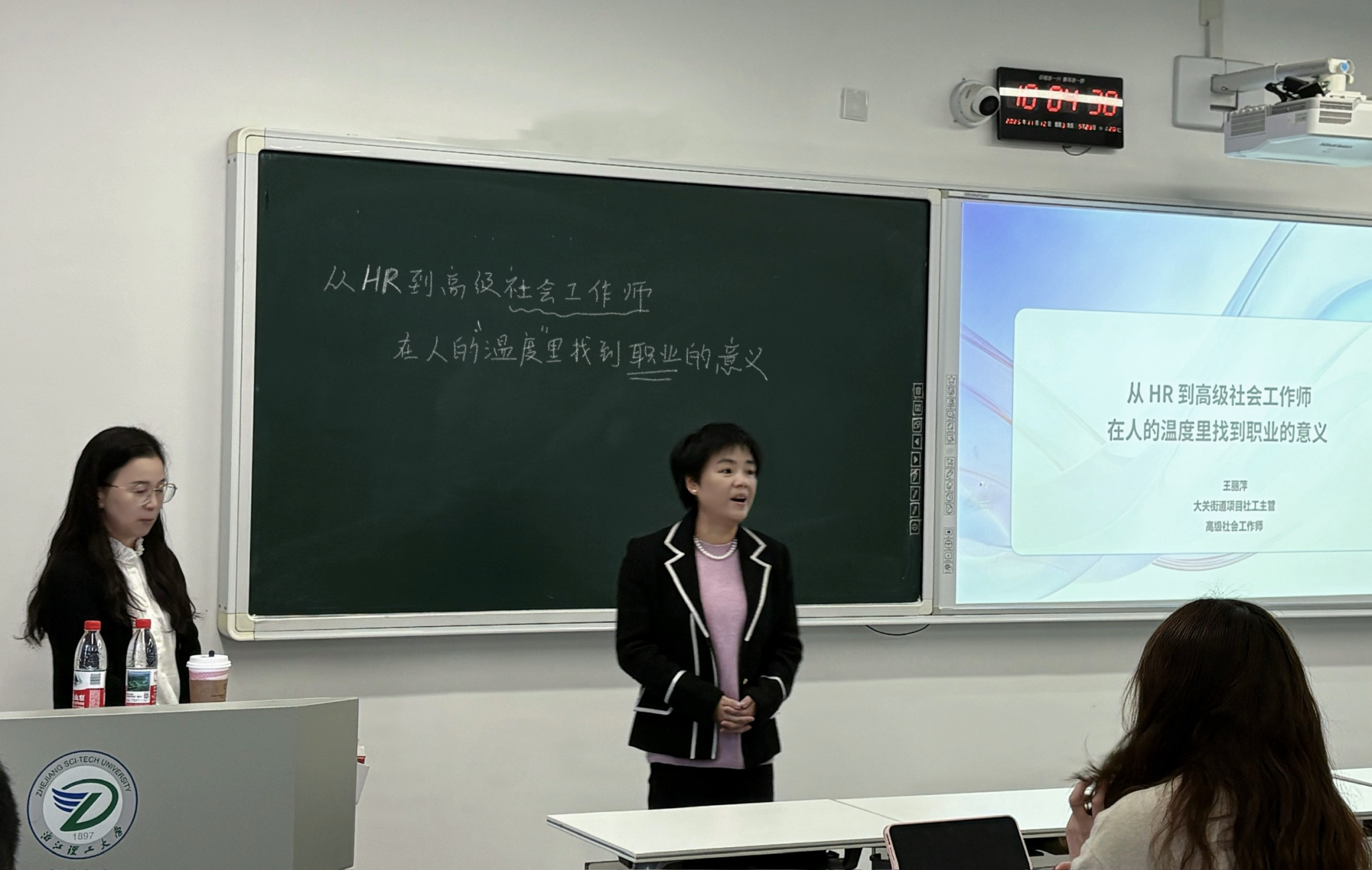 为了提高公司社会工作专业硕士的实务能力, 2025年11月12日,拱墅区高级社会工作师王丽萍来访我院,在L4-220教室为社会工作专业的硕士生进行了一场社会工作行业发展与职业规划的专题讲座,题目为《从HR到高级社工师:在人的温度里找到职业的意义》。讲座由社会工作系主任朱静主持。
