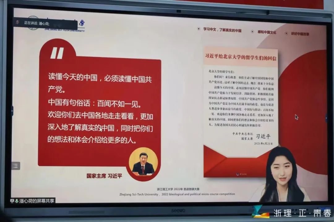 潘心荷老师以在华职工的眼光来品读真正的中国共产党。中文的阴阳上去中回荡着慷慨激昂,倾诉着温婉缠绵,中国话是中国人心灵深处的吐纳。在传统节日中,在与中国人民的交往中,在“梦行浙江”中,他们理解了中华民族的民族精神是传承与奉献,见证中国共产党“两山理论”在浙江的生动实践。在抗击新冠疫情的过程中,他们看清了中国作为一个负责任的大国,始终坚持的是“人类命运共同体”。