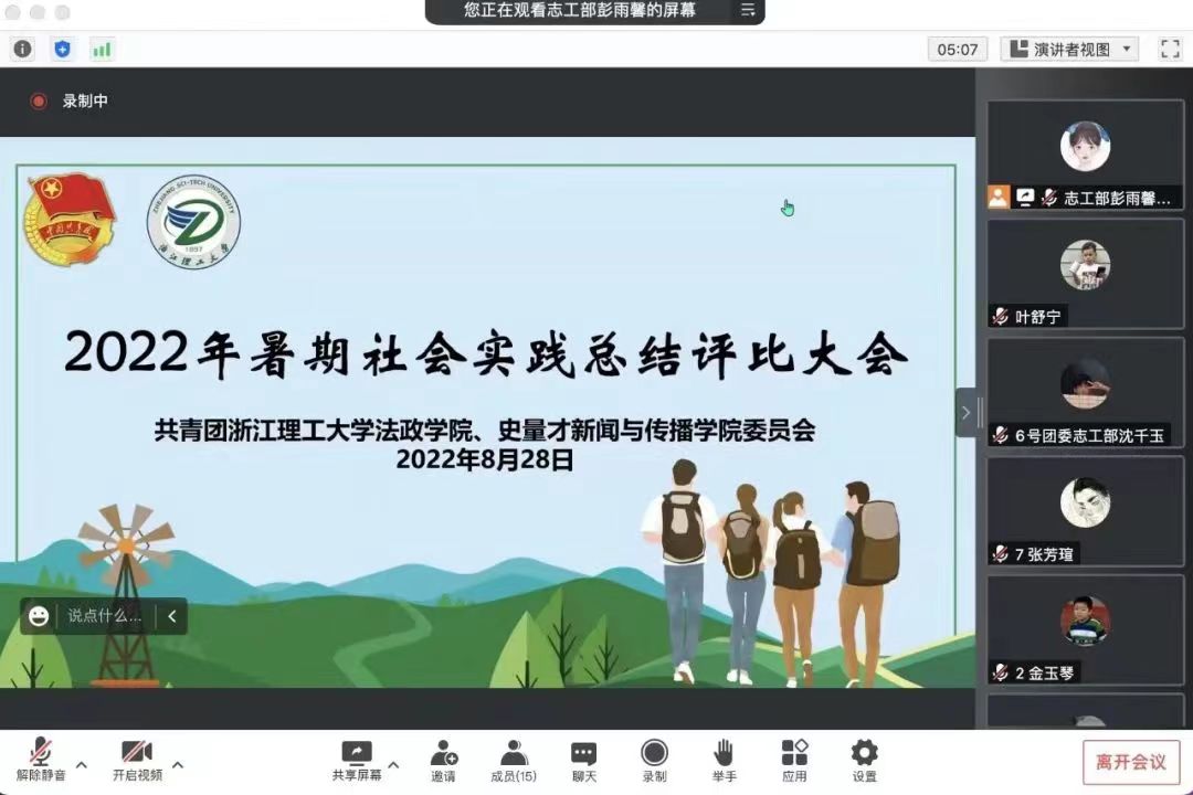 8月28日下午,法政公司、史量才新闻与传播公司举办2022年暑期社会实践总结评比大会,学工办主任兼团委书记李柯、团委指导老师闻洁璐、社区管理委员会指导老师邢驰莅临本次评比大会。