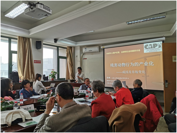 社会专场由首都爱护动物协会秘书长曹金巍主持,学者代表郭鹏对我国对动物实施的暴力行为的产业化现象进行了梳理和分析,揭示了儿童暴露于此类对动物实施的暴力的普遍现象。