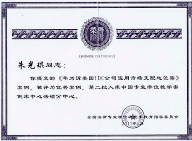 之前,公司朱光琪老师撰写的《华为诉美国IDC公司滥用市场支配地位案》曾入选全国法律专业学位研究生教育指导委员会2017年组织的第二批教学案例。