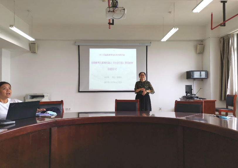 本次研讨会的主题是“思政教育元素有机融入社会工作专业课程《社会行政》教学课题研讨”。聂玉梅老师首先指出思政教育元素融入大学课堂教育的必要性,以及社会工作专业课程性质、内容与思政教育相结合的重要性与可行性,然后就课题研究内容本身即“思政元素如何融入《社会行政》课程”进行了详细介绍与经验分享,最后的教学研讨环节,与会的老师们就课程思政与专业课程的有机融入进行了热烈的讨论与深入的交流。特别是融入哪些内容、如何融入,以及如何引导员工等形式和内容交换了相互的看法和经验。